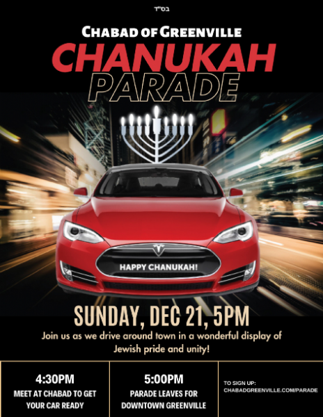December 21, 2025 Cars come to Chabad at 4:30pm and get a Menorah, ready to get on the parade line. Parade begins at 5:00pm to Downtown Greenville.